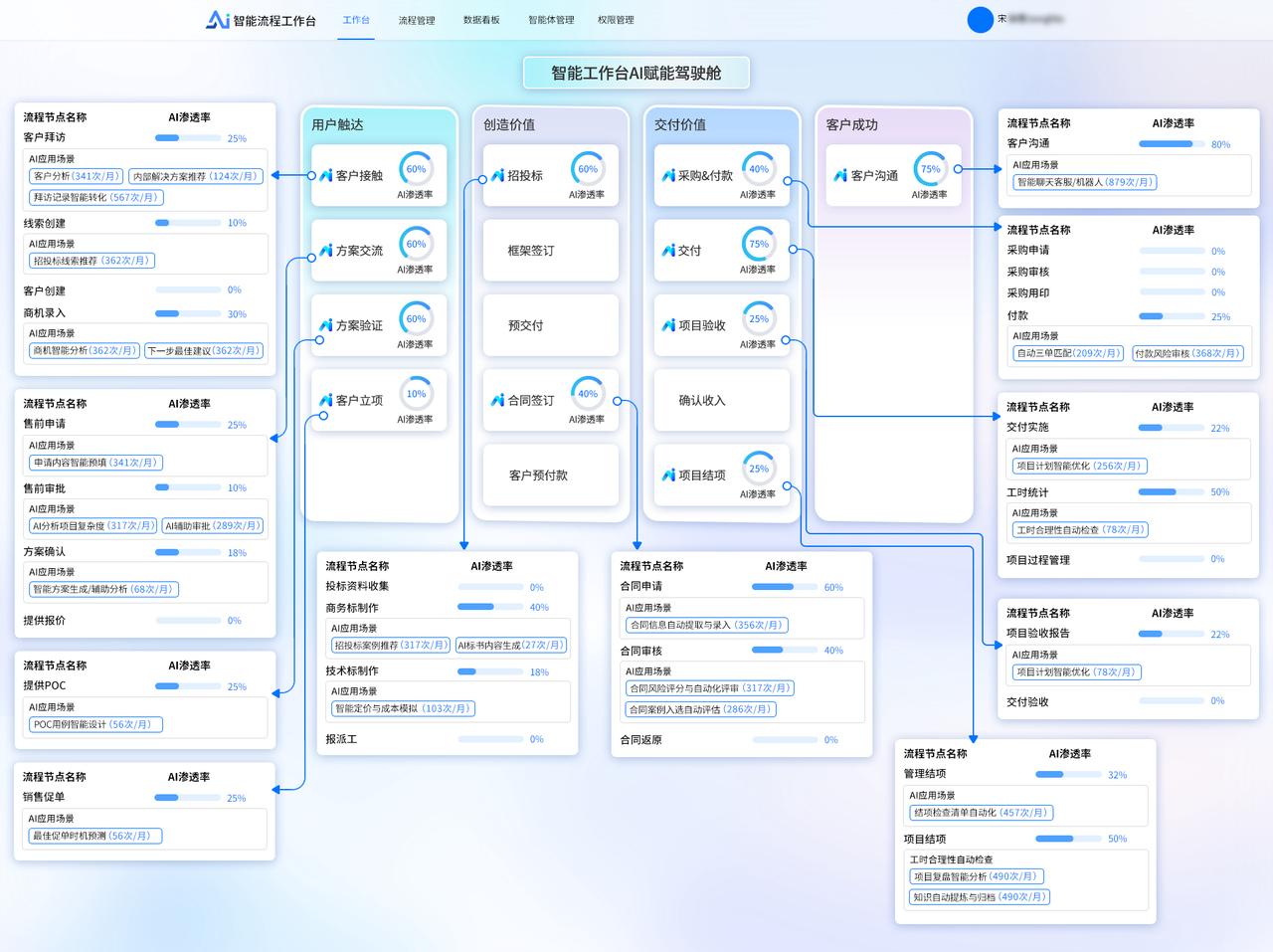 ? 將業務流程以作戰地圖的形式進行可視化呈現,清晰展示流程的各個環節、節點之間的關系以及當前流程所處階段